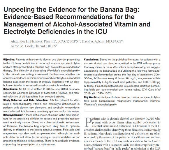 Alex Flannery and Aaron Cook joined me for the FIRST EVER Trial of the Week to dive into their infamous 2016 Critical Care Medicine article entitled: “Unpeeling the Evidence for the Banana Bag: Evidence-Based Recommendations for the Management of Alcohol-Associated Vitamin and Electrolyte Deficiencies in the ICU”