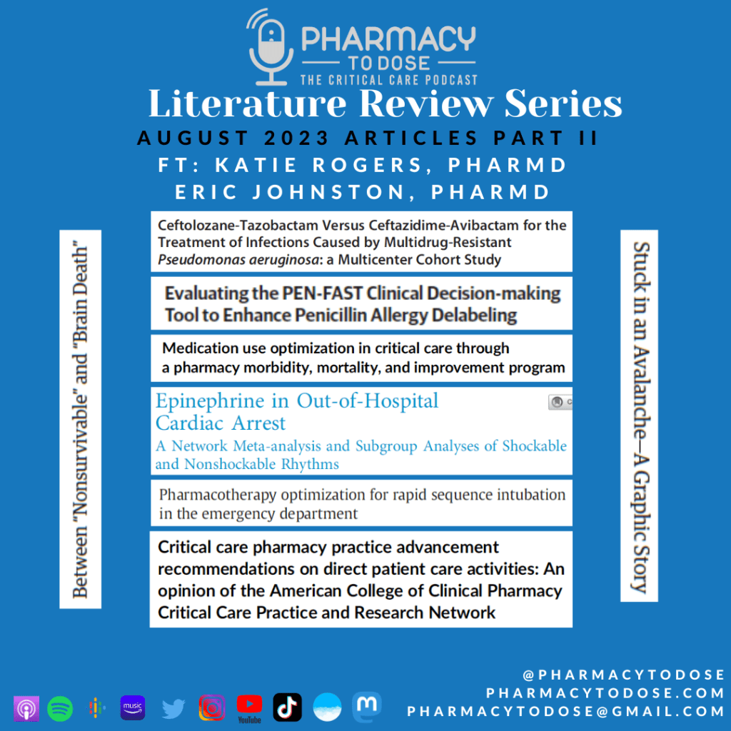 Katie Rogers and Eric Johnston join me to highlight some of the most pertinent articles published in August 2023. We highlight 6 featured articles, with the first 3 all having Pharmacist authors. Then we review articles with a sepsis and ID theme before hitting a potpourri section.