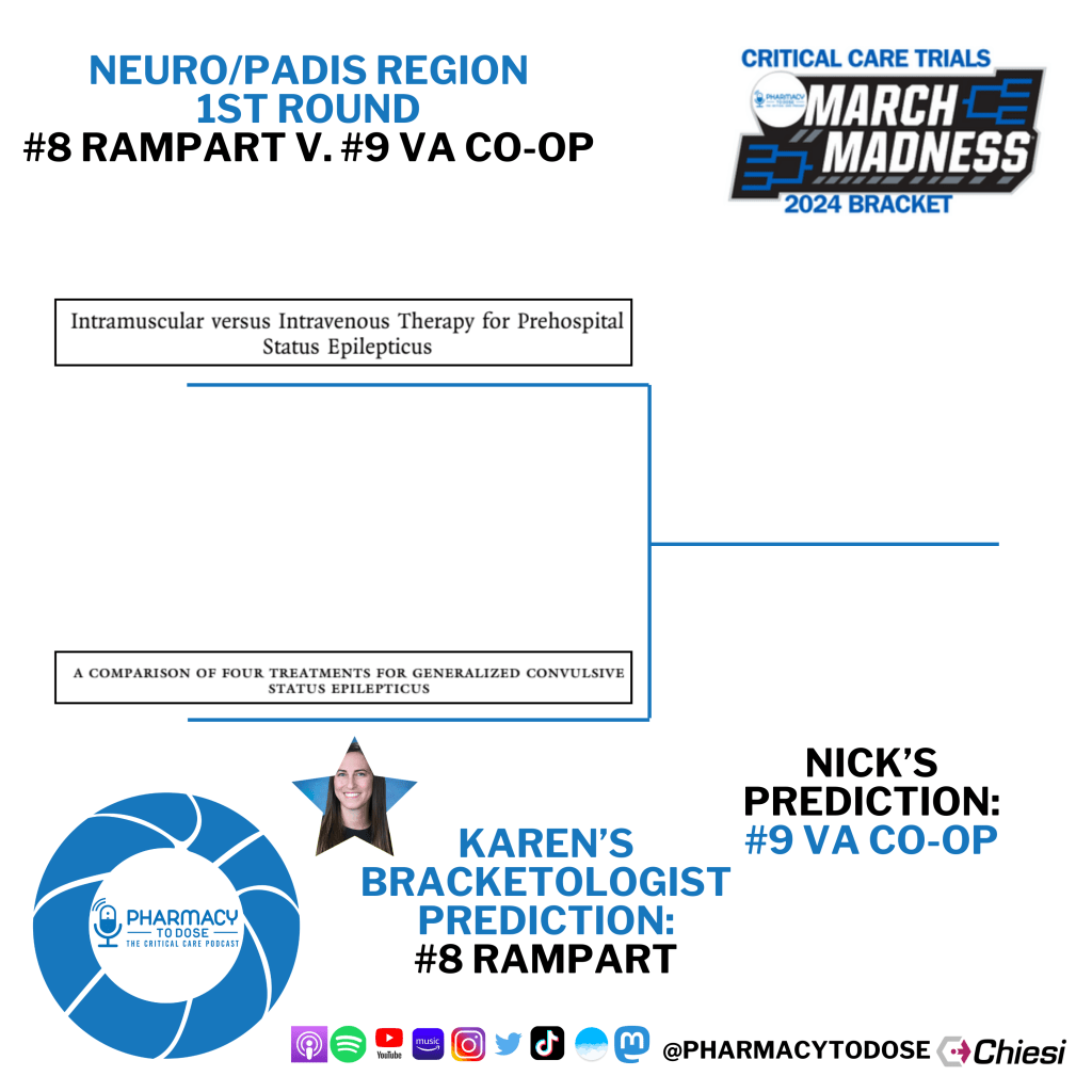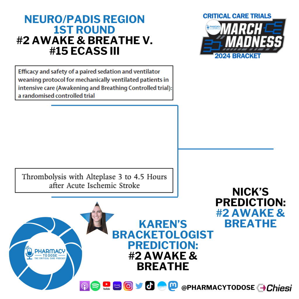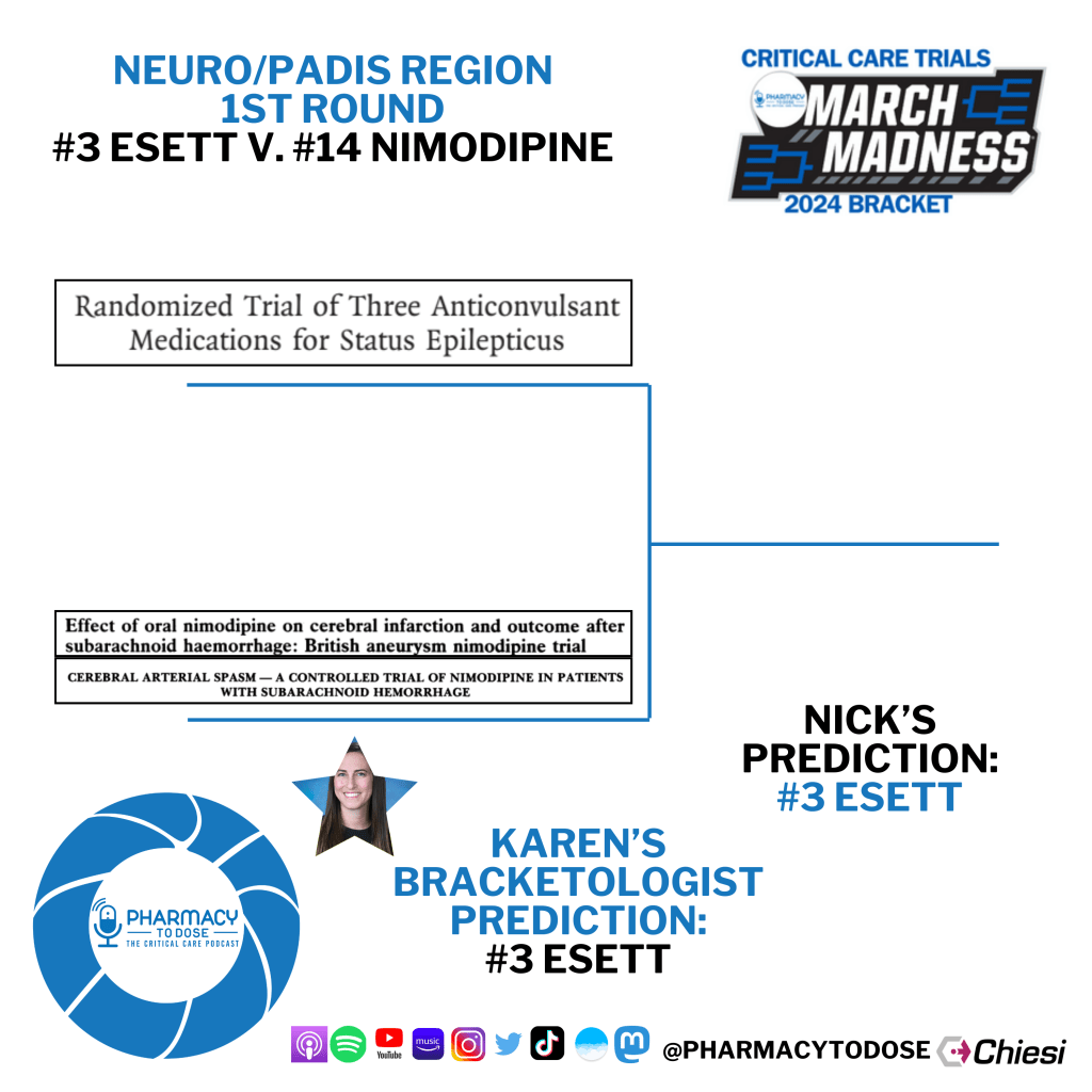 Now let’s preview all 8 matchups. Click the trial name to go to their PubMed page, but you can also browse the abstract screenshots as well as see who Karen Berger, this region’s Bracketologist, and I predict will win.