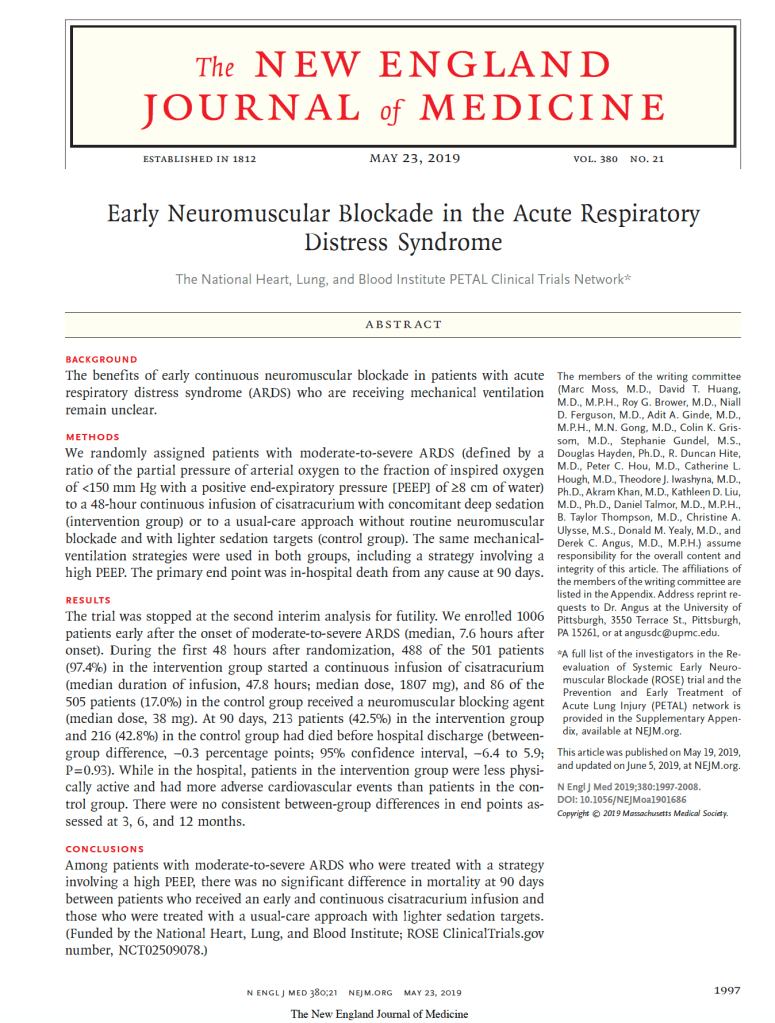 Christina Rose joins to highlight a July Trial of the Week “Early Neuromuscular Blockade in the Acute Respiratory Distress Syndrome” aka the ROSE trial, published in the New England Journal of Medicine in 2019.