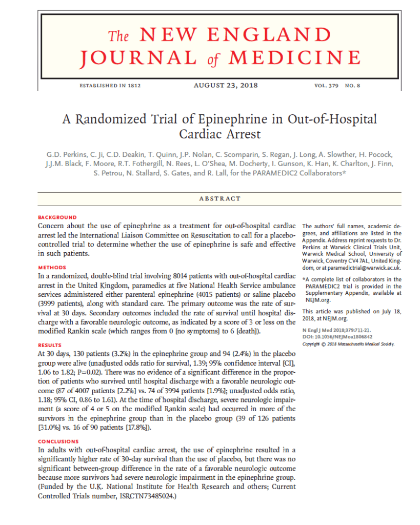 Scott Benken joins to highlight an August Trial of the Week “A Randomized Trial of Epinephrine in Out-of-Hospital Cardiac Arrest aka the PARAMEDIC2 study, published in the New England Journal of Medicine in 2018.