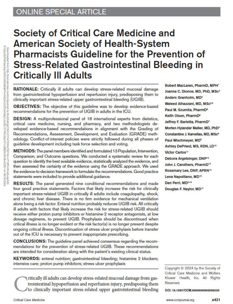 Stress Ulcer Prophylaxis features the amazing Rob MacLaren, Critical Care Pharmacist and first author on the 2024 SCCM/ASHP stress ulcer prophylaxis guidelines. We review the history of guideline recommendations, the 2024 guideline timeline, landmark research studies, “PICO question categories,” PPIs v. H2RA, REVISE trial overview, impelementing the guidelines, research priorities, take-home points, and so, so much more.