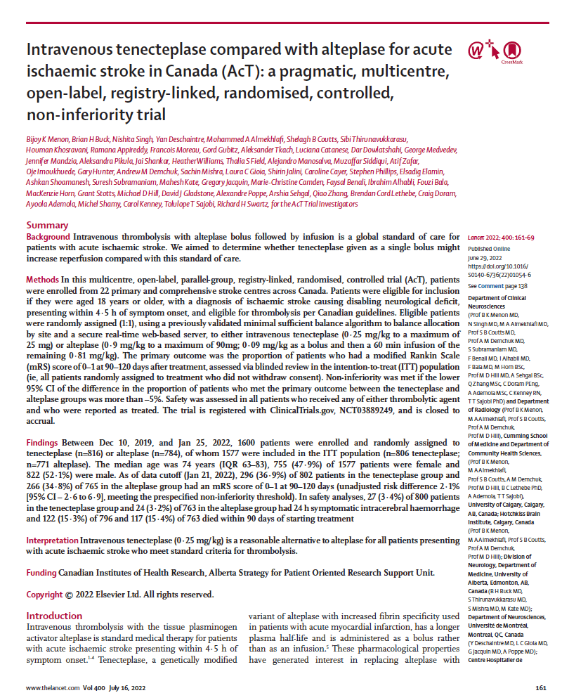 #5 ACT “Intravenous tenecteplase compared with alteplase for acute ischemic stroke in Canada (AcT): a pragmatic, multicentre, open-label, registry-linked, randomised, controlled, non-inferiority trial”