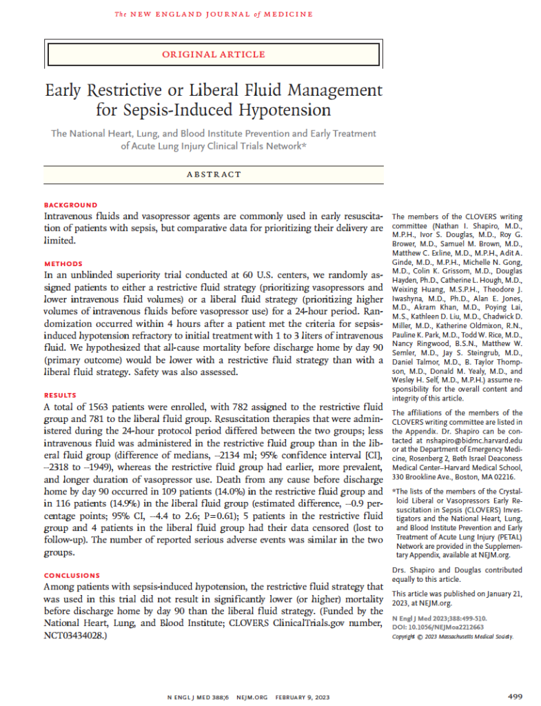 #9 CLOVERS “Early restrictive or liberal fluid management for sepsis-induced hypotension”