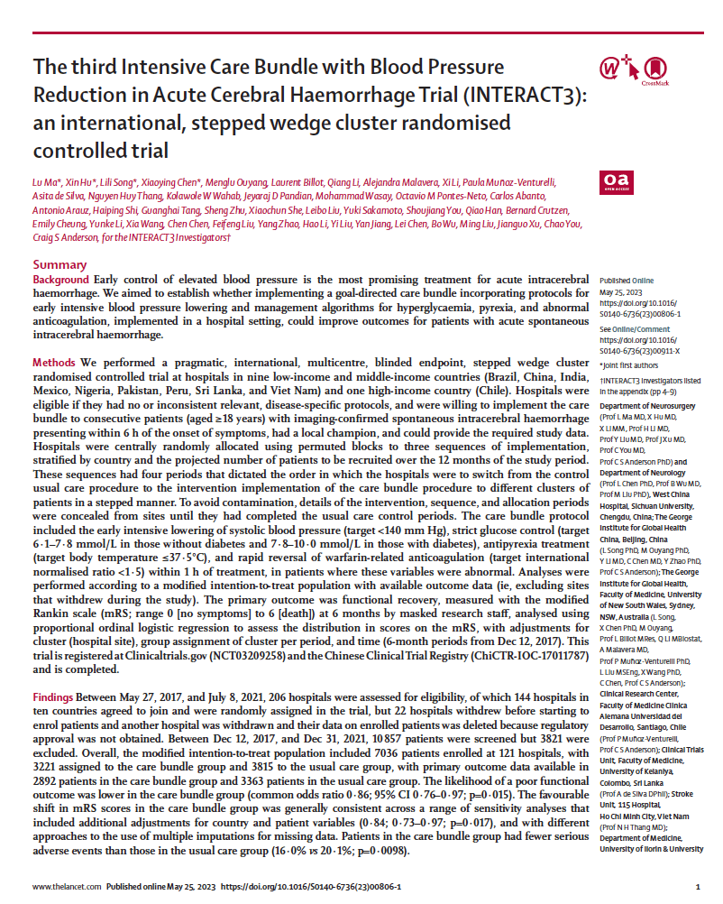 #12 INTERACT3 “The third intensive care bundle with blood pressure reduction in acute cerebral hemorrhage trial (INTERACT3): an international, stepped wedge cluster randomised controlled trial”