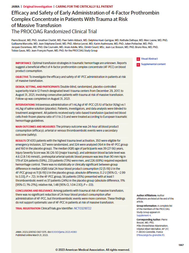 #14 PROCOAG “Efficacy and safety of early administration of 4-factor prothrombin complex concentrate in patients with trauma at risk of massive transfusion: the PROCOAG randomized clinical trial”