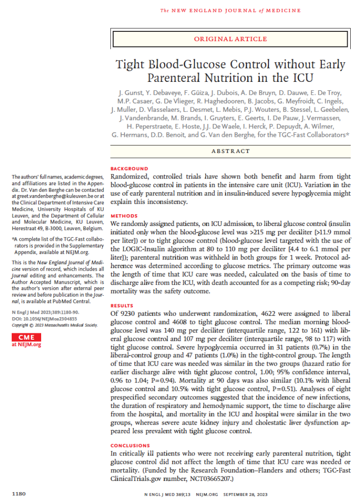 #16 TGC-FAST “Tight blood-glucose control without early parenteral nutrition in the ICU”